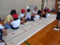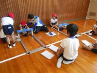 6月4日、新体力テストがありました。最初に担当の先生の説明を聞いた後、縦割り班でそれぞれの種目に挑戦しました。この日記録を測定したのは握力などの5種目で、縦割り班の低学年の記録を高学年の子が記録したり、高学年の子のチャレンジする様子を低学年の子が応援したりする微笑ましい光景が見られました。いっしょにやってよかったね。